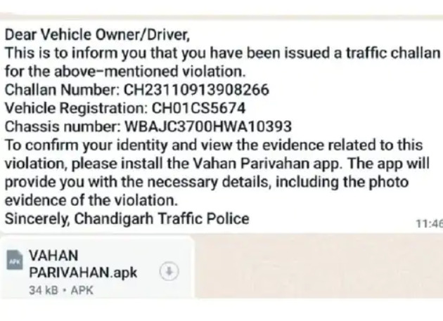 चंडीगढ़ में लगातार ट्रैफिक चालान के नाम पर फर्जी संदेश भेजने का फर्जीवाड़ा चल रहा है। ट्रैफिक पुलिस भी ऐसे फर्जी ई-चालान लिंक से बचने के लिए लोगों को जागरूक कर रही है। इसके लिए बाकायदा एडवाइजरी भी जारी की है कि ई-चालान होने की जानकारी व्हाट्सएप के जरिए मिली है तो सावधान हो जाएं। यह चालान फर्जी है। इसमें दिए लिंक पर क्लिक कर और बताए गए वाहन परिवहन एप (VAHANparivahan.apk) को डाउनलोड कर आप साइबर ठगी का शिकार हो सकते हैं।