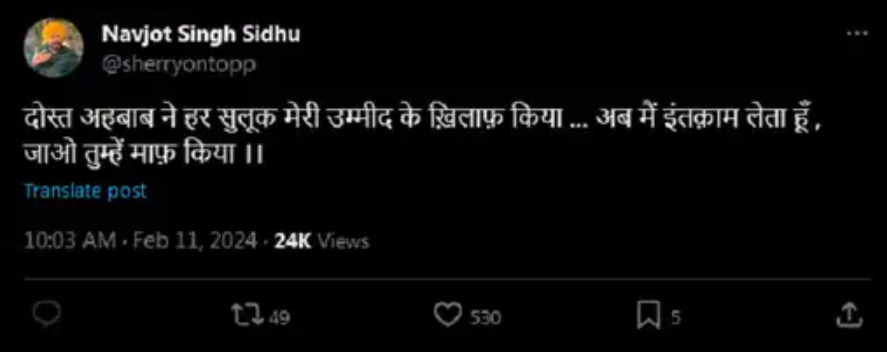 वहीं, कुछ समय बाद उन्होंने दूसरी पोस्ट शेयर करते हुए विरोधियों को माफ करने की बात कही है। शायराना अंदाज में सिद्धू ने इस पोस्ट को शेयर किया है। सिद्धू ने कहा- दोस्त अहबाब ने हर सुलूक मेरी उम्मीद के खिलाफ किया। अब मैं इंतकाम लेता हूं, जाओ तुम्हें माफ किया।