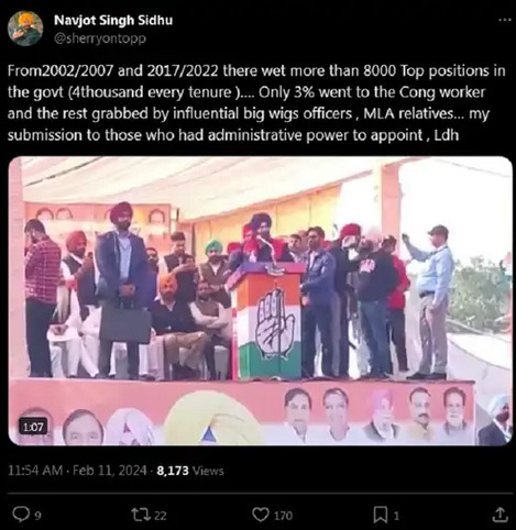 अब, नवजोत सिंह सिद्धू की तरफ से तीसरी पोस्ट शेयर की गई है। जिसमें उन्होंने अपना एक पुराना वीडियो शेयर किया है और कांग्रेस सीनियर लीडर्स को निशाना बनाया है। सिद्धू ने इसमें कहा- 2002/2007 और 2017/2022 तक सरकार में 8000 से अधिक शीर्ष पद (प्रत्येक कार्यकाल में 4 हजार)… केवल 3% कांग्रेस कार्यकर्ताओं के पास गया और बाकी प्रभावशाली बड़े विग अधिकारियों, विधायक रिश्तेदारों द्वारा हड़प लिया गया। जिनके पास नियुक्ति करने की प्रशासनिक शक्ति थी, उन्हें मेरा समर्पण, लुधियाना।