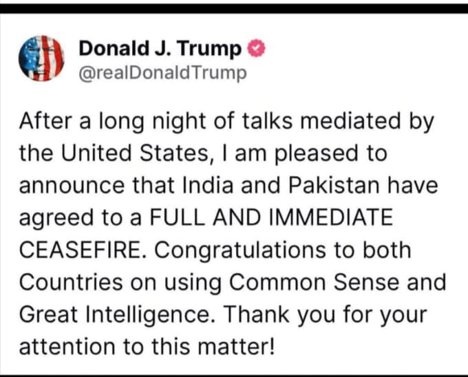 भारत और पाकिस्तान सीजफायर के लिए राजी हो गए हैं। यह दावा यूएस राष्ट्रपति डोनाल्ड ट्रम्प ने किया। डोनाल्ड ट्रम्प ने कहा, ‘रात यूएसए की मध्यस्थता में चली लंबी बातचीत के बाद मुझे बताते हुए खुशी हो रही है कि भारत और पाकिस्तान तुरंत और पूरी तरह हमले रोकने के लिए तैयार हो गए हैं। मैं दोनों देशों को कॉमनसेंस, समझदारी से भरा फैसला लेने के लिए बधाई देता हूं।’