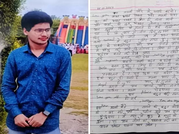 पापा खुश रहा करिए आप की हंसी बहुत ही प्यारी है। मम्मा आप तो मेरी एंजल हो। आज की गलती के कारण मैं आप से नजरें नहीं मिला पाउंगा। मम्मा प्लीज रोइएगा मत। लव यू ऑल पापा बहुत बड़ी गलती हो गई, पापा यू आर माई हीरो। पापा-मम्मी मैंने सुइसाइड लगाने की बहुत कोशिश की कर नहीं पाया। प्लीज अब मत ढूढिएगा। मैं नहर में कूदकर खुद को मार लूंगा, पर अब लोगों का सामना नहीं कर पाउंगा। अपना ख्याल रखिएगा आप लोगा।