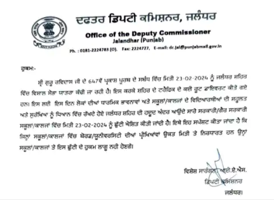 23 फरवरी यानी शुक्रवार को सभी सरकारी और गैर सरकारी शिक्षण संस्थान बंद रहेंगे। श्री गुरु रविदास जी की 647वीं जयंती के मद्देनजर निकाली जाने वाली शोभायात्रा को लेकर डीसी विशेष सारंगल ने ये ऐलान किया है।इससे पहले जालंधर से आम आदमी पार्टी के सांसद सुशील रिंकू ने डीसी से आग्रह किया था कि शोभायात्रा में भाग लेने बड़ी संख्या में लोग आते हैं। उन्होंने शहर के सभी शिक्षण संस्थानों में पूरे दिन की छुट्टी की मांग की थी। पहले से निर्धारित बोर्ड और यूनीवर्सिटीज की परीक्षाएं इसी दिन होंगी।