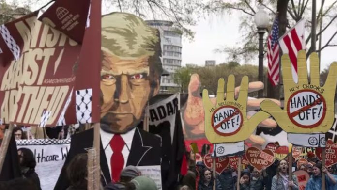 Hands Off Protest In US Against Donald Trump: राष्ट्रपति डोनाल्ड ट्रंप की नीतियों के खिलाफ अमेरिका में उबाल आ गया है। अमेरिका में शनिवार को ‘हैंड्स ऑफ! प्रोटेस्ट के तहत हजारों प्रदर्शनकारी सड़कों पर उतरे और राष्ट्रपति डोनाल्ड ट्रंप प्रशासन और एलन मस्क की नीतियों के खिलाफ जोरदार विरोध प्रदर्शन किया। यह हाल के समय में ट्रंप प्रशासन के खिलाफ अब तक का सबसे बड़ा राष्ट्रव्यापी प्रदर्शन रहा, जिसमें अमेरिका के 50 राज्यों में 1,200 से अधिक स्थानों पर विरोध रैलियां आयोजित की गईं। विरोध प्रदर्शनों में LGBTQ+ समेत 150 से अधिक संगठनों ने भाग लिया।