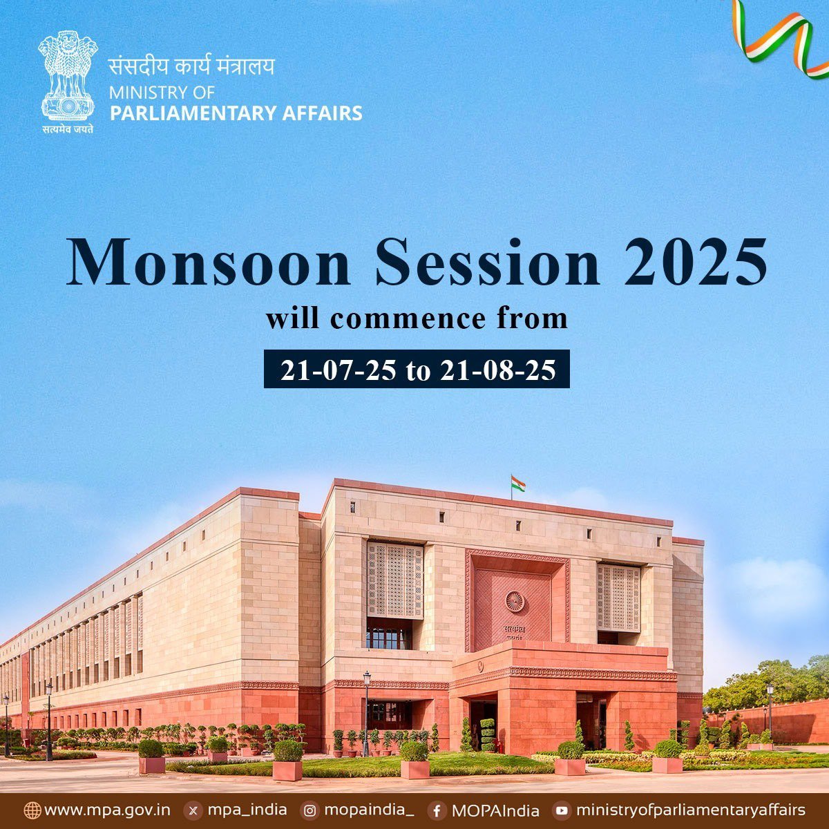 18वीं लोकसभा का दूसरा मानसून सत्र-2025 आज से शुरू हो रहा है। संसद का मानसून सत्र आज यानी 21 जुलाई से शुरू होकर 21 अगस्त तक चलेगा। ऑपरेशन सिंदूर, भारत-पाकिस्तान सीजफायर पर ट्रंप का दावा और बिहार में SIR पर संग्राम समेत कई मुद्दों को लेकर संसद का मानसून सत्र धमाकेदार होने वाला है। विपक्ष (इंडिया गठबंधन) ने बिहार के वोटर वेरिफिकेशन, पहलगाम आतंकी हमला, ऑपरेशन सिंदूर, सीजफायर और अमेरिकी राष्ट्रपति डोनाल्ड ट्रंप के 20 से ज्यादा बार भारत-पाकिस्तान के बीच युद्ध रुकवाने के दावे को लेकर मोदी सरकार को घेरने की तैयारी कर ली है। इस दौरान आपको एक्शन और ड्रामा देखने को मिल सकता है।