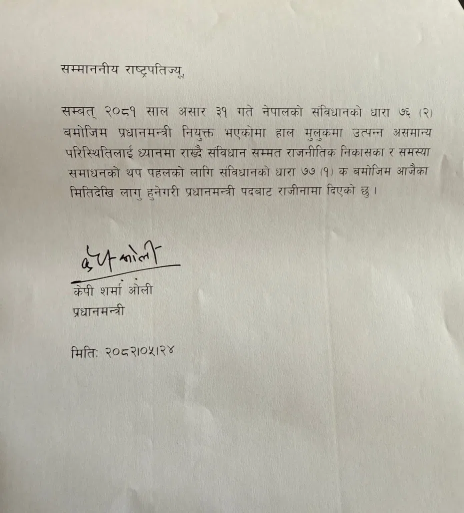 बताया जा रहा है कि सैकड़ों की संख्या में प्रदर्शनकारी उनके दफ्तर में घुस गए थे, जिसके बाद उन्होंने अपने पद से इस्तीफा दिया है. पीएम ओली ने अपने इस्तीफे वाली चिट्ठी राष्ट्रपति को सौंपी है. देश में लगातार चल रही हिंसा और विद्रोह की वजह से उन्हें अपना पद छोड़ना पड़ा है।