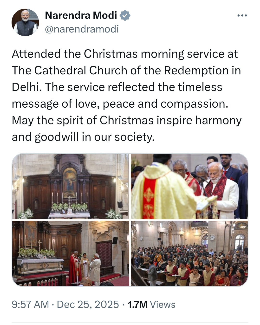 पीएम मोदी ने सोशल मीडिया पर चर्च की तस्वीरें पोस्ट करते हुए लिखा कि दिल्ली में द कैथेड्रल चर्च ऑफ़ द रिडेम्पशन में क्रिसमस की सुबह की प्रार्थना में शामिल हुआ. इस प्रार्थना में प्यार, शांति और करुणा का शाश्वत संदेश झलका है. उम्मीद है कि क्रिसमस की भावना हमारे समाज में सद्भाव और भाईचारा लाएगी।