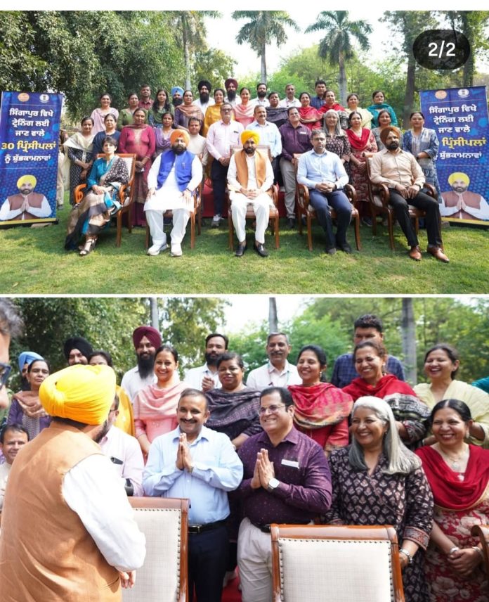 पंजाब के मुख्यमंत्री भगवंत सिंह मान ने आज सिंगापुर की प्रिंसिपल अकादमी में प्रशिक्षण के लिए 30 सरकारी स्कूलों के प्रिंसिपलों के आठवें बैच को हरी झंडी दिखाकर रवाना किया। इस अवसर पर उन्होंने कहा कि इस पहल का उद्देश्य शिक्षकों को वैश्विक शिक्षा पद्धतियों से परिचित कराना और राज्य की सार्वजनिक शिक्षा व्यवस्था को और मजबूत बनाना है।