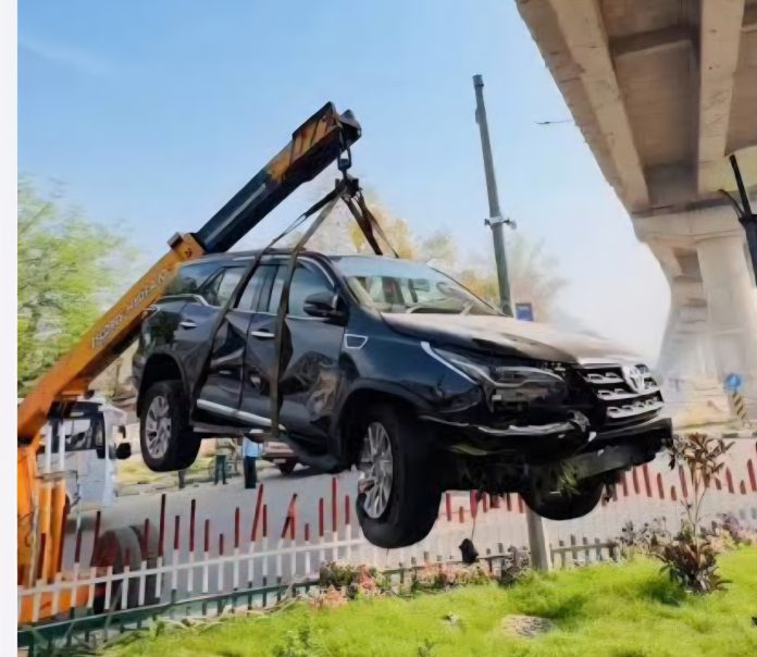 लुधियाना के भारत नगर चौक पर रविवार देर रात एक हादसा हुआ, जिसमें कोई बड़ा नुक्सान होने से बच गया।यहां एक तेज रफ्तार काली फॉर्च्यूनर कार बेकाबू होकर चौक के बीचों-बीच बने ‘आई लव लुधियाना’ सेल्फी प्वाईट के स्ट्रक्चर से टकरा गई। टक्कर इतनी जोरदार थी कि कार 3 फुट ऊंचे सिक्योरिटी पिलर को तोड़कर अंदर चली गई। हादसे के वक्त कार में दो युवक थे जो गाड़ी में फंस गए।
