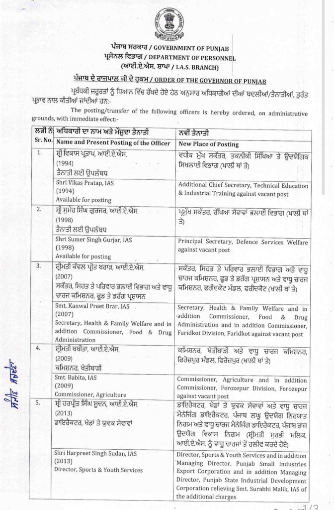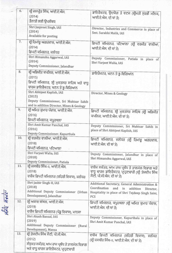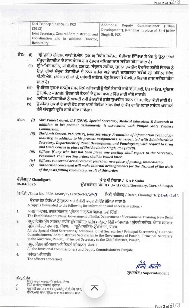 Homeपंजाबपंजाब सरकार ने IAS अधिकारियों के किए ट्रांसफर, वरजीत वालिया होंगे जालंधर... पंजाब पंजाब सरकार ने IAS अधिकारियों के किए ट्रांसफर, वरजीत वालिया होंगे जालंधर के नए डीसी By Editor NRI Sanjh April 6, 2026 Share FacebookTwitterPinterestWhatsApp पंजाब सरकार ने एक बड़े प्रशासनिक फेरबदल के तहत कई वरिष्ठ IAS अधिकारियों के तबादलों और नियुक्तियों के आदेश जारी किए हैं। इन आदेशों से कई जिलों के डिप्टी कमिश्नर बदल गए है। TagsHindi newsNEWS SAMACHAR Share FacebookTwitterPinterestWhatsApp Previous articleसीएम मान ने कहा, बारिश और औलावृष्टि से खराब फसलों की गिरदावरी करवाएगी सरकारNext articleपंजाब पुलिस के काउंटर इंटेलिजेंस विंग ने तीन मुलजिमों को दो आर्गस हैंड ग्रेनेडों और एक विदेशी ग्लॉक पिस्तौल सहित किया गिरफ्तार Editor NRI Sanjh RELATED ARTICLES पंजाब पंजाब पुलिस के काउंटर इंटेलिजेंस विंग ने तीन मुलजिमों को दो आर्गस हैंड ग्रेनेडों और एक विदेशी ग्लॉक पिस्तौल सहित किया गिरफ्तार April 6, 2026 पंजाब सीएम मान ने कहा, बारिश और औलावृष्टि से खराब फसलों की गिरदावरी करवाएगी सरकार April 6, 2026 पंजाब हेमकुंट साहिब की यात्रा के लिए तैयारियां शुरू April 6, 2026 Most Popular पंजाब पुलिस के काउंटर इंटेलिजेंस विंग ने तीन मुलजिमों को दो आर्गस हैंड ग्रेनेडों और एक विदेशी ग्लॉक पिस्तौल सहित किया गिरफ्तार April 6, 2026 सीएम मान ने कहा, बारिश और औलावृष्टि से खराब फसलों की गिरदावरी करवाएगी सरकार April 6, 2026 हेमकुंट साहिब की यात्रा के लिए तैयारियां शुरू April 6, 2026 मोहाली कोर्ट को भी बम से उड़ाने की मिली धमकी April 6, 2026 Load more Recent Comments