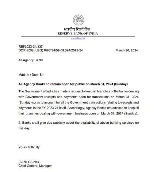 RBI के सर्कुलर के मुताबिक “बैंकों को सलाह दी जाती है कि वे सरकारी बिजनेस से संबंधित अपनी सभी ब्रांच को 31 मार्च 2024, रविवार के दिनखुला रखेंगे। 31 मार्च 2024 को रविवार की छुट्टी होने के बावजूद सभी एजेंसी बैंक जनता के लिए खुले रहेंगे।