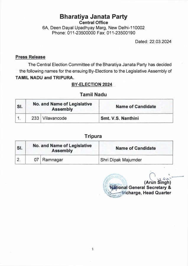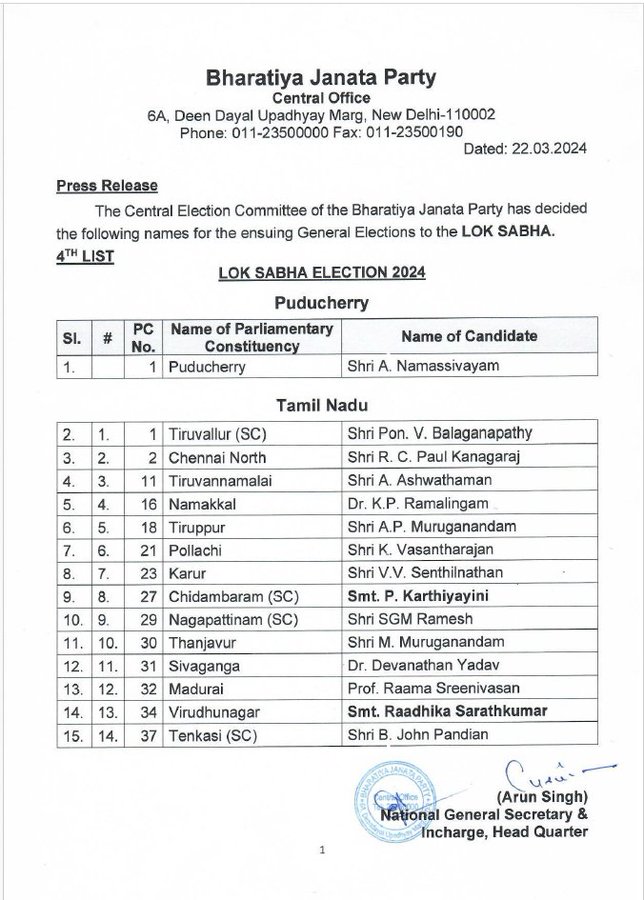 लोकसभा चुनाव के लिए भाजपा ने 15 उम्मीदवारों की अपनी चौथी लिस्ट जारी कर दी है। पार्टी ने अपनी चौथी लिस्ट में दक्षिण भारत के राज्य तमिलनाडु से 14 और पुड्डुचेरी से एक उम्मीदवार के नाम का ऐलान कर दिया है। इसके साथ ही पार्टी ने तमिलनाडु और त्रिपुरा में होने वाले विधानसभा उपचुनाव के लिए भी एक-एक उम्मीदवार के नाम की घोषणा की है। पार्टी ने तमिलनाडु के तिरुवल्लुर से पोन. वी. बालगणपति, नमक्कल से केपी. रामलिंगम, तिरुपूर से एपी. मुरुगानंदम, चिदंबरम से पी. कार्थियाइनी और मदुरई से रामा श्रीनिवासन सहित तमिलनाडु से 14 उम्मीदवारों के नामों का ऐलान किया है।