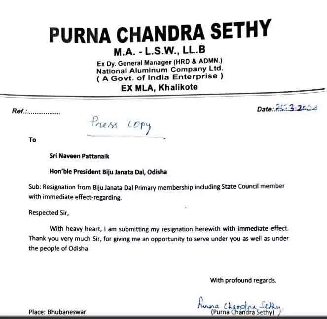 ओडिशा में पूर्व विधायक पूर्ण चंद्र सेठी ने ओडिशा में विधानसभा और लोकसभा चुनाव से पहले सोमवार को सत्तारूढ़ बीजू जनता दल से इस्तीफा दे दिया। पूर्ण चंद्र सेठी 2009 से 2019 तक गंजम जिले की खलीकोट विधानसभा सीट से दो बार विधायक निर्वाचित हुए। उन्होंने अपना इस्तीफा ओडिशा के मुख्यमंत्री नवीन पटनायक को भेजा।