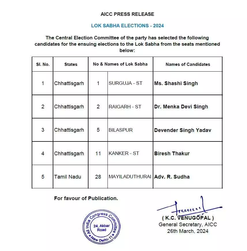 कांग्रेस ने छत्तीसगढ़ लोकसभा के 4 सीटों पर उम्मीदवारों का किया ऐलान