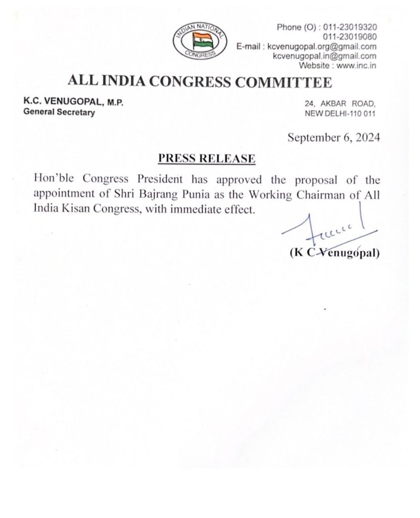 कुश्ती के अखाड़े को छोड़कर बजरंग पूनिया सियासी अखाड़े में उतर चुके हैं। बजरंग पूनिया के साथ विनेश फोगाट ने हरियाणा विधानसभा चुनाव से पहले कांग्रेस ज्वाइन किया है कांग्रेस ज्वाइन करते हुए बजरंग पूनिया को बड़ी जिम्मेदारी सौंपी गई है। बजरंग पूनिया को अखिल भारतीय किसान कांग्रेस का वर्किंग चेयरमैन बनाया गया है।