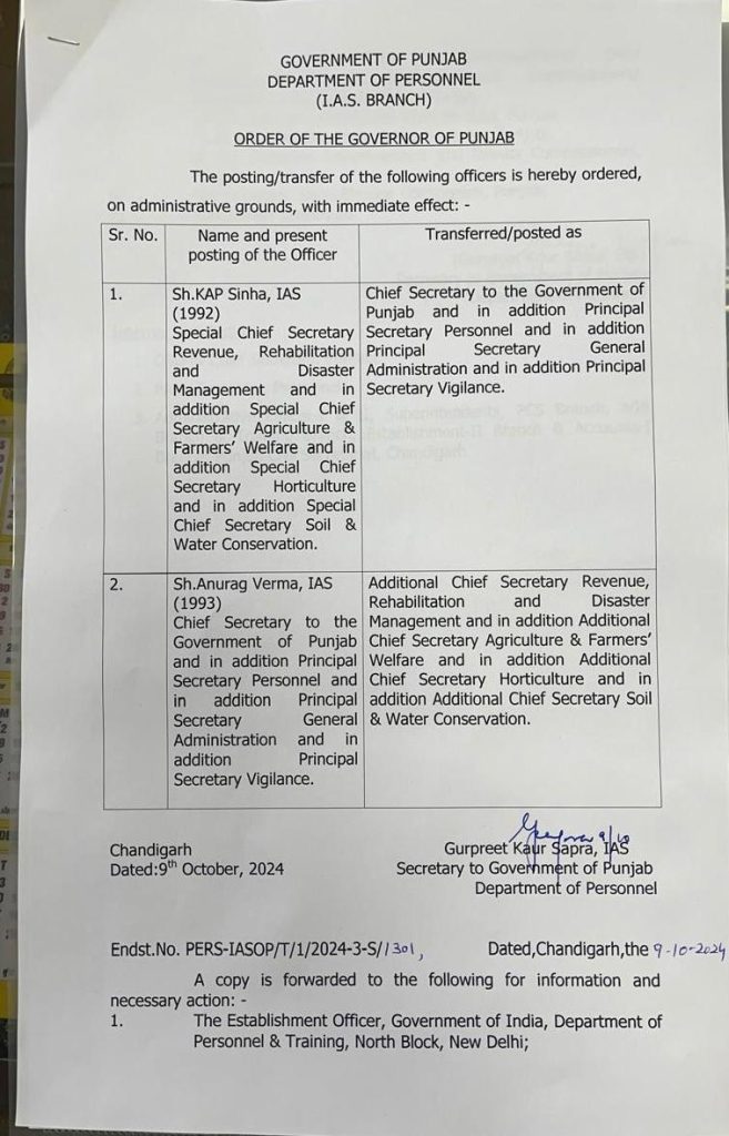 हालांकि लंबे समय से चर्चा चल रही थी कि पंजाब मुख्यमंत्री कार्यालय में बड़े बदलाव होंगे। वहीं अनुराग वर्मा को राजस्व, पुनर्वास एवं आपदा प्रबंधन, कृषि एवं किसान कल्याण, बागवानी और मृदा एवं जल संरक्षण का अतिरिक्त मुख्य सचिव नियुक्त किया गया है।