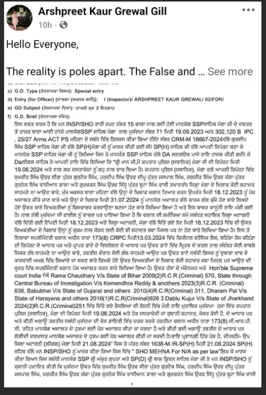 अर्शप्रीत ने लिखा कि कुछ दिनों के बाद वरिष्ठ अधिकारियों को पता चला कि मैंने ऐसी डीडीआर प्रविष्टि डाली है और उन्होंने मुझे कहा “बख्शा गे नहीं तेनू” कहकर परेशान करना शुरू कर दिया और एसपी-डी बाल कृष्ण सिंगला ने अन्य पूछताछ में बयान दर्ज करने के लिए मुझे कई बार अपने कार्यालय में बुलाया। और मुझे बुरा भला कहा। “तू याद रखेगी वी डीडीआर एंट्री किवे पाई दी है। “मैं इस पोस्ट के साथ DDR ENTRY संलग्न करूंगी। पूरी मोगा पुलिस जानती है कि एसपी डी किसी न किसी तरीके से मुझे मानसिक रूप से परेशान कर रहे थे।